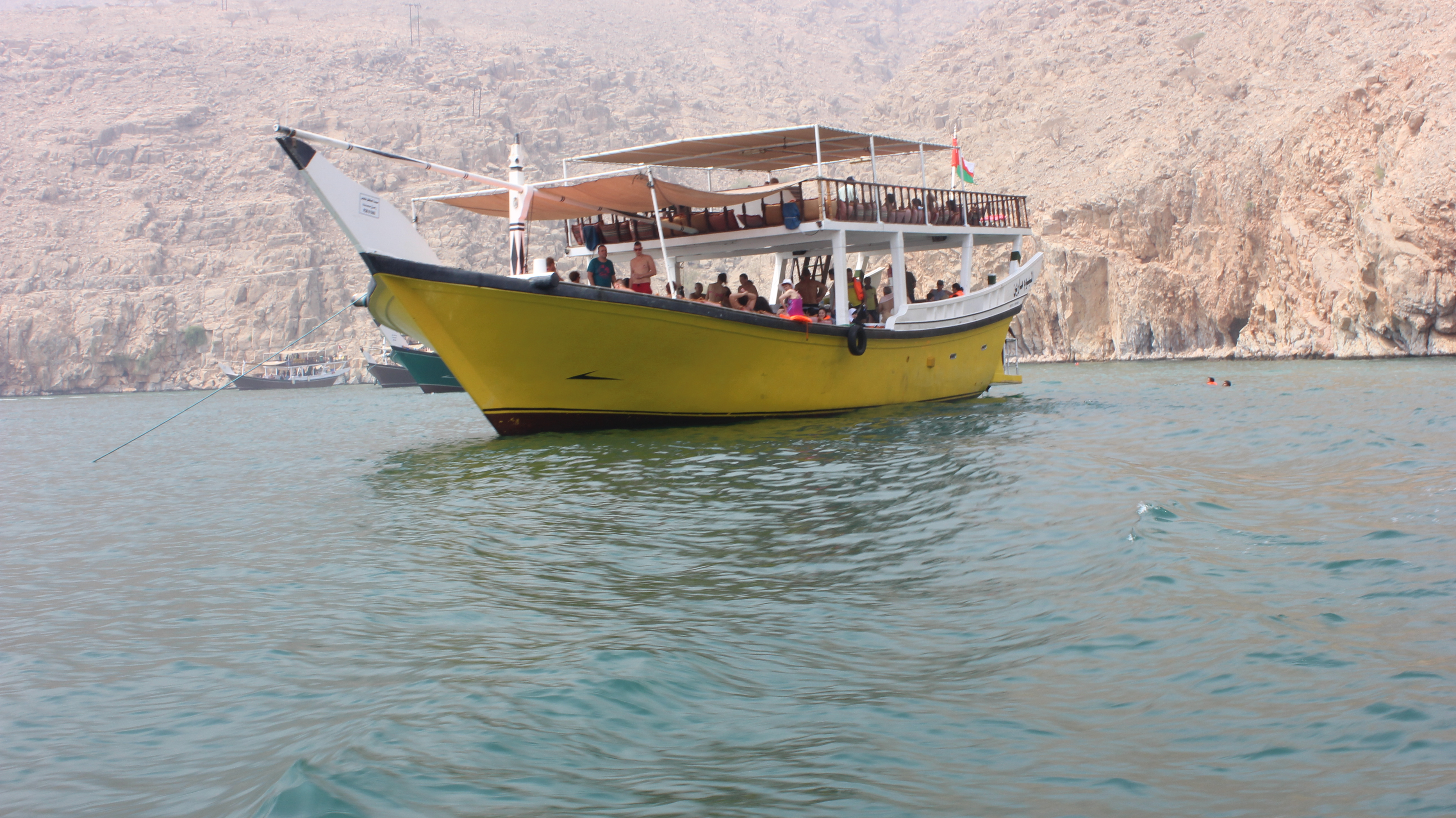 Arrive at the Khasab harbor and board the traditional Omani dhow for the Half day cruise into the spectacular, scenic and tranquil fiord, the khor as Shimm and the longest fiords in the Musandam peninsula. Observe the coastal villages as we cruise along and there’s a very good possibility to sight the playful dolphins and many exotic marine creatures. We anchor at the famous Telegraph Island, which was a repeatt station built in 1864 by the Vritish to connect Bombay (India) with mainland Britain by an underwater and overland telegraphic cable passing via Basra in Iraq and Turkey. Enjoy swimming and snorkeling at the Telegraph Island in the pristine and calm water of the fiord. Refreshments are served onboard. Snorkeling equipments and towels will be provided on the dhow.