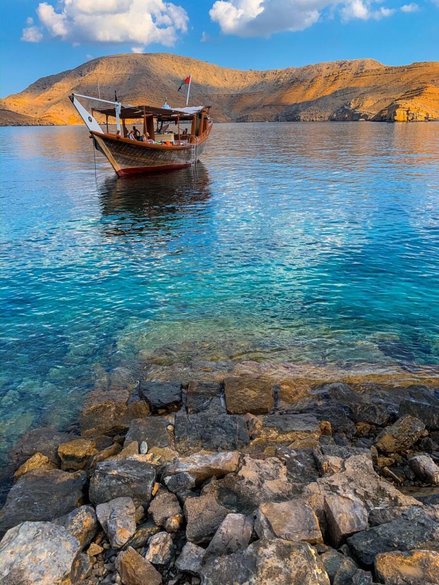 Arrive at the Khasab harbor and board the traditional Omani dhow for the full day cruise into the spectacular, scenic and tranquil fiord, the khor as Shimm(18kms long) and the longest fiords in the Musandam peninsula. Observe the coastal villages of Nadifi, Qanaha, Maqlab, Seebi and hamlets as we cruise along and there’s a very good possibility to sight the playful dolphins and many other exotic marine creatures. We anchor at the famous Telegraph Island, which was a repeat station built in 1864 by the British to connect Bombay (India) with mainland Britain by an underwater and overland telegraphic cable passing via Basra in Iraq and Turkey. Enjoy swimming and snorkeling at the Telegraph Island and the Seebi Island in the pristine and calm waters of the fiord. Fishing will also be arranged during the cruise. Lunch and refreshments are served onboard. Snorkeling equipments and towels will be provided on the dhow.